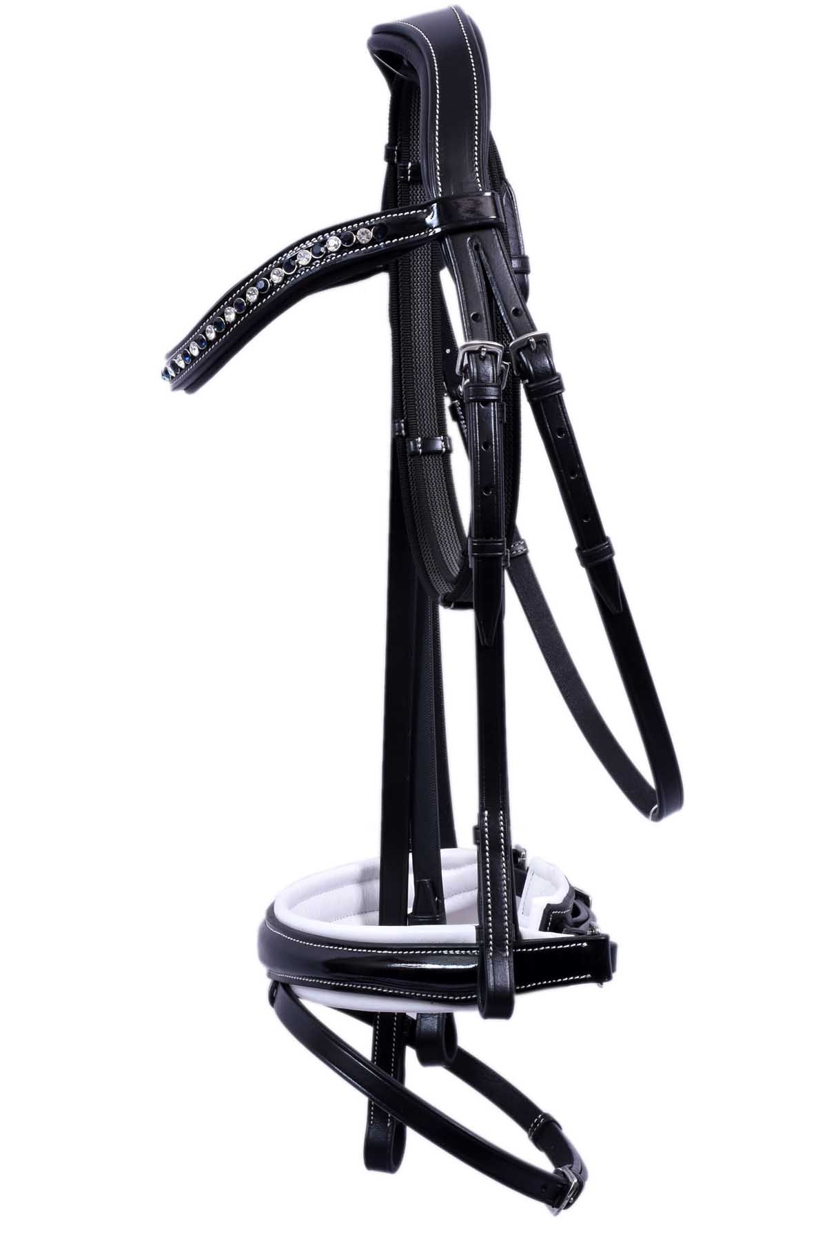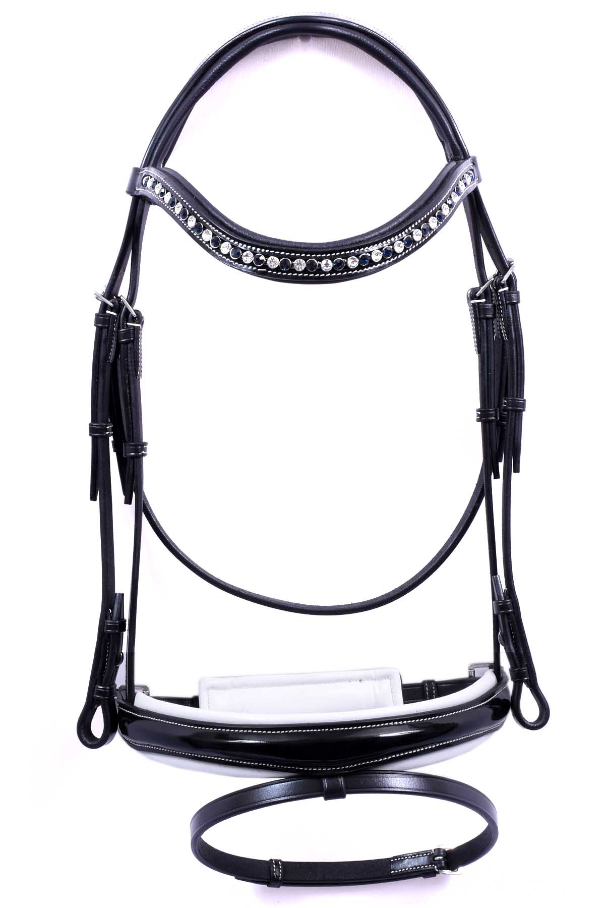 This is premium quality of dressage bridle made of Indian tanned leather and patent leather. Anatomical style headpiece with matching Soft leather padded. it has a special throat-lash fastener, to avoid any additional pressure above the head. Easy adjustment of throat-lash from either side. decorated Soft leather padded & curved browband with Blue+white diamond crystals inlay decorated .Dom shape raised Draft style noseband with white soft leather padded underside which looks elegance. This bridle is delivered with pairs of plain leather snaffle reins and curb reins each . All stainless steel fittings.